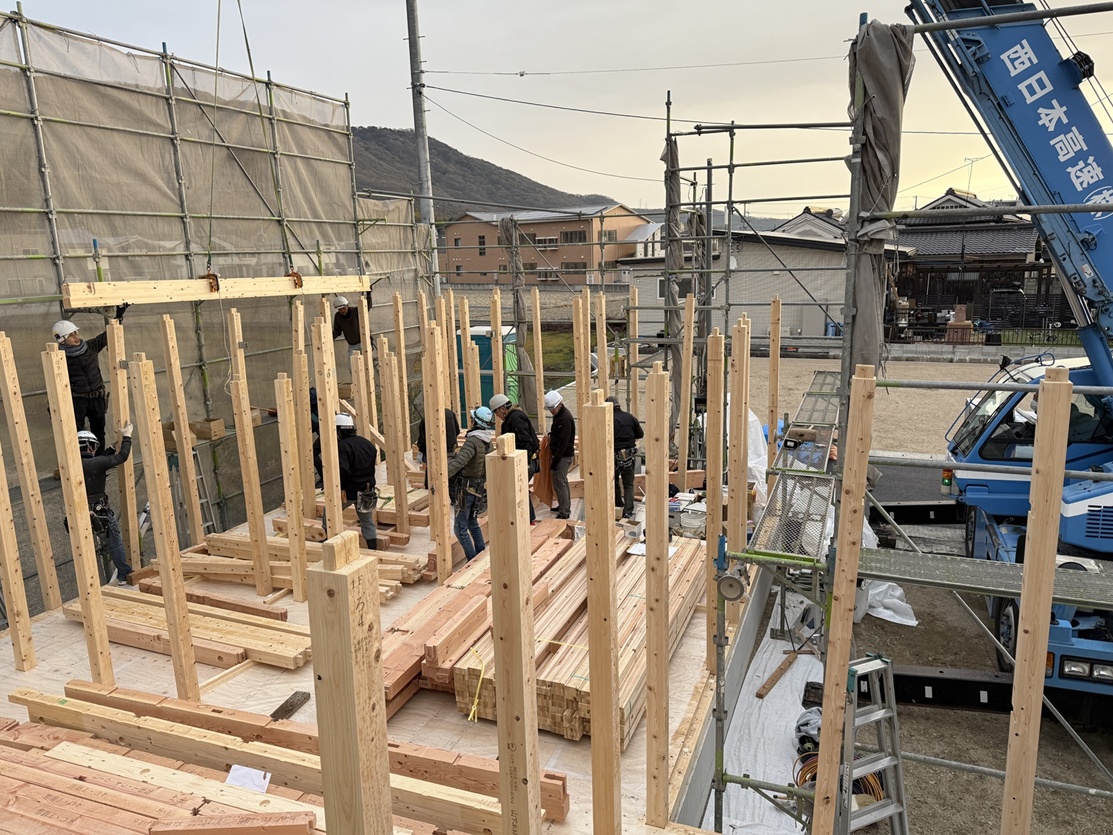 大きなレッカーと大工さんが柱を次々と立てていきます。