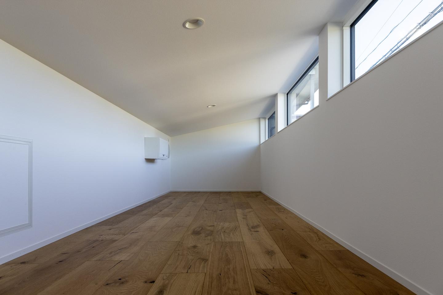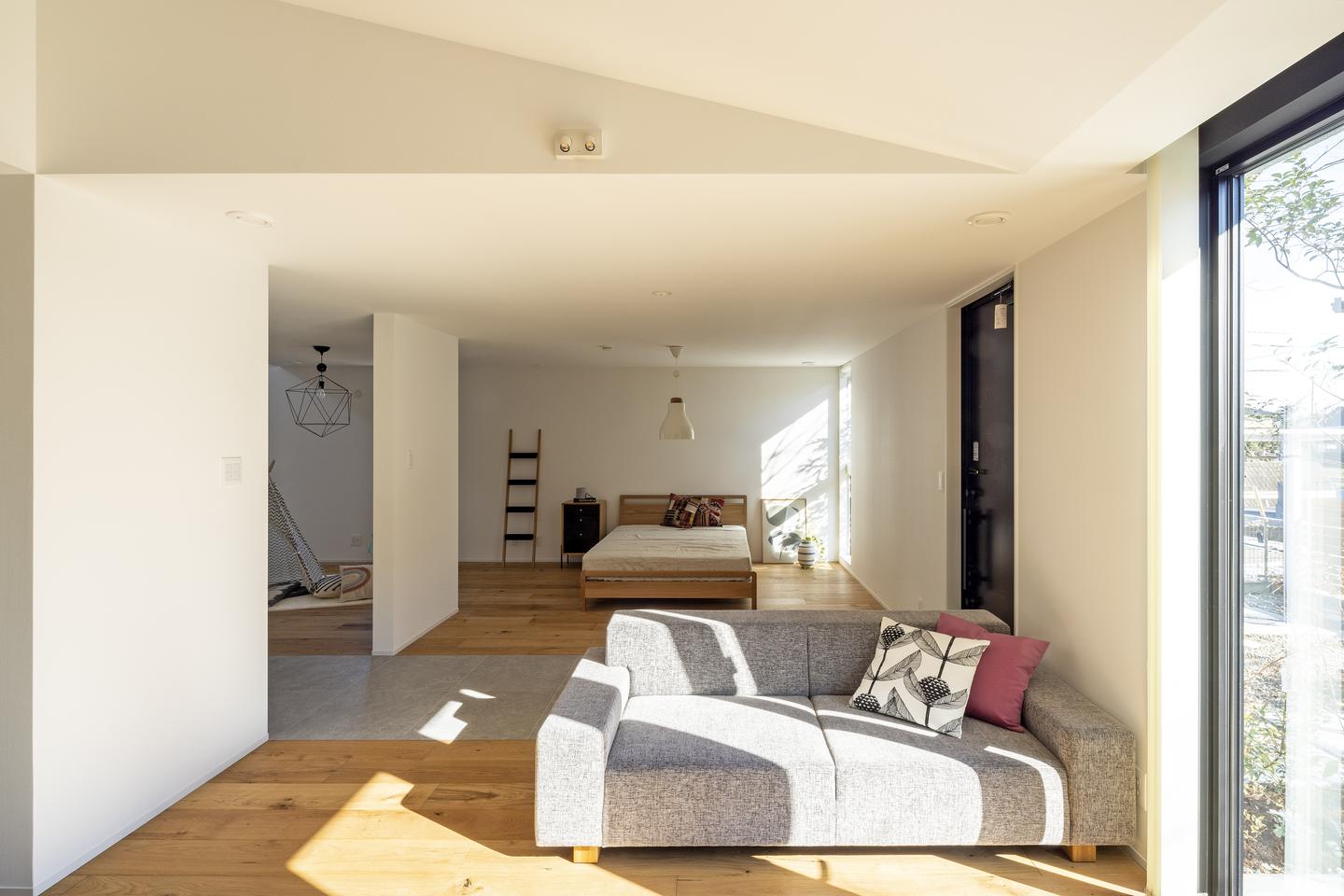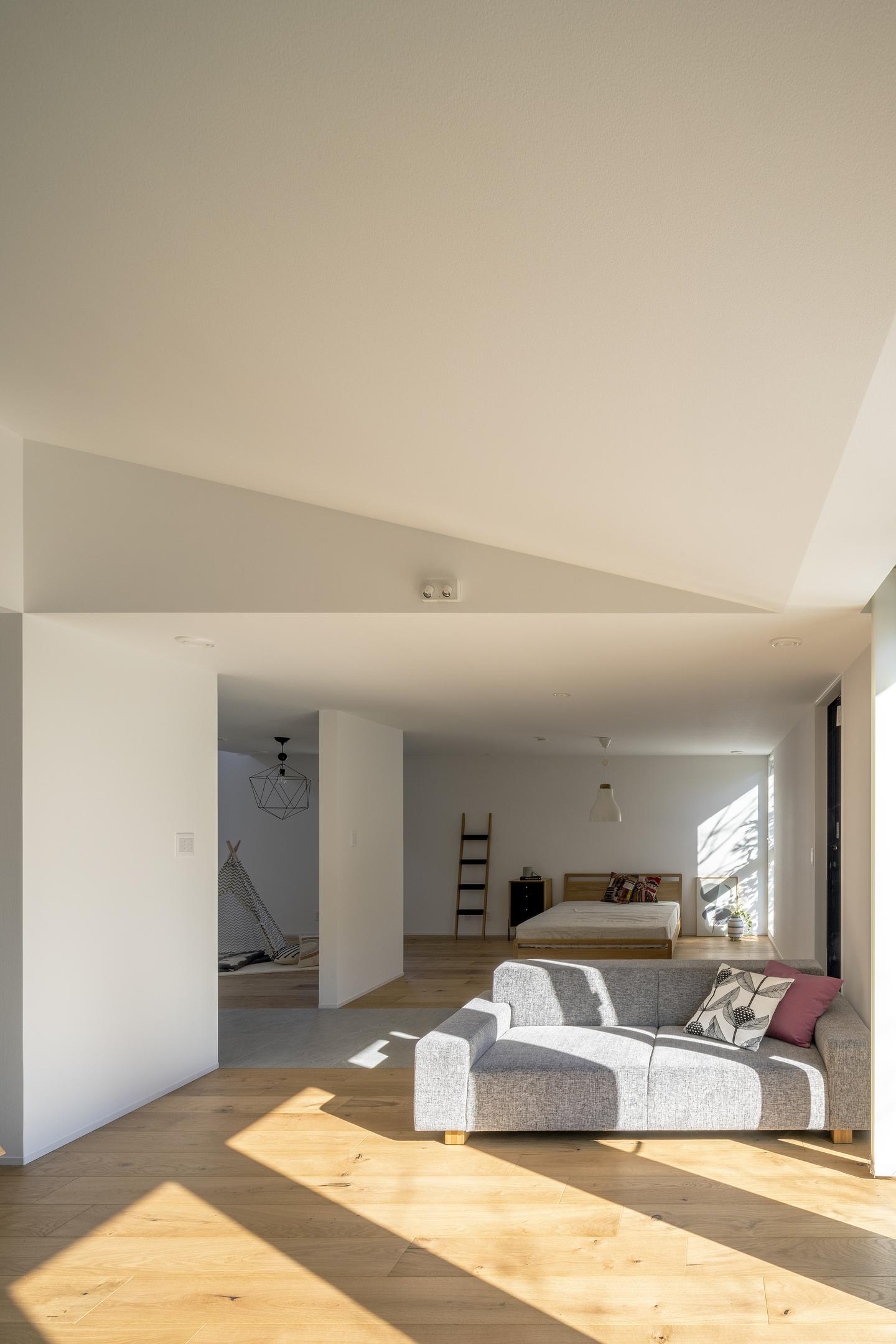 勾配天井へと続く大きな窓から、やわらかな自然光が降り注ぎ、心地よい空間を演出します。