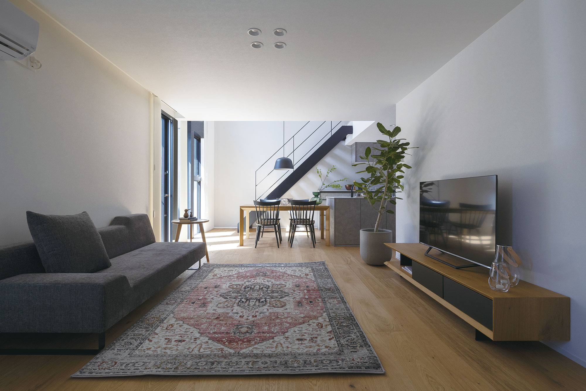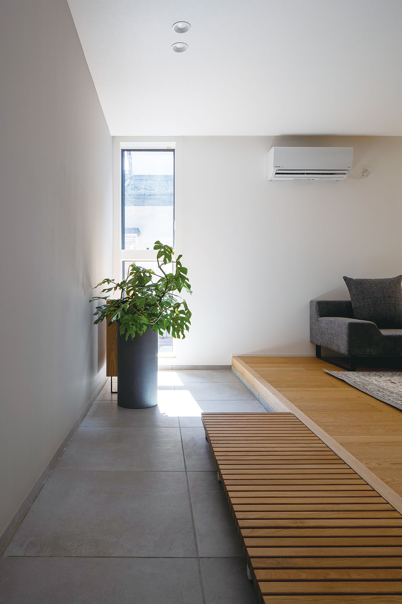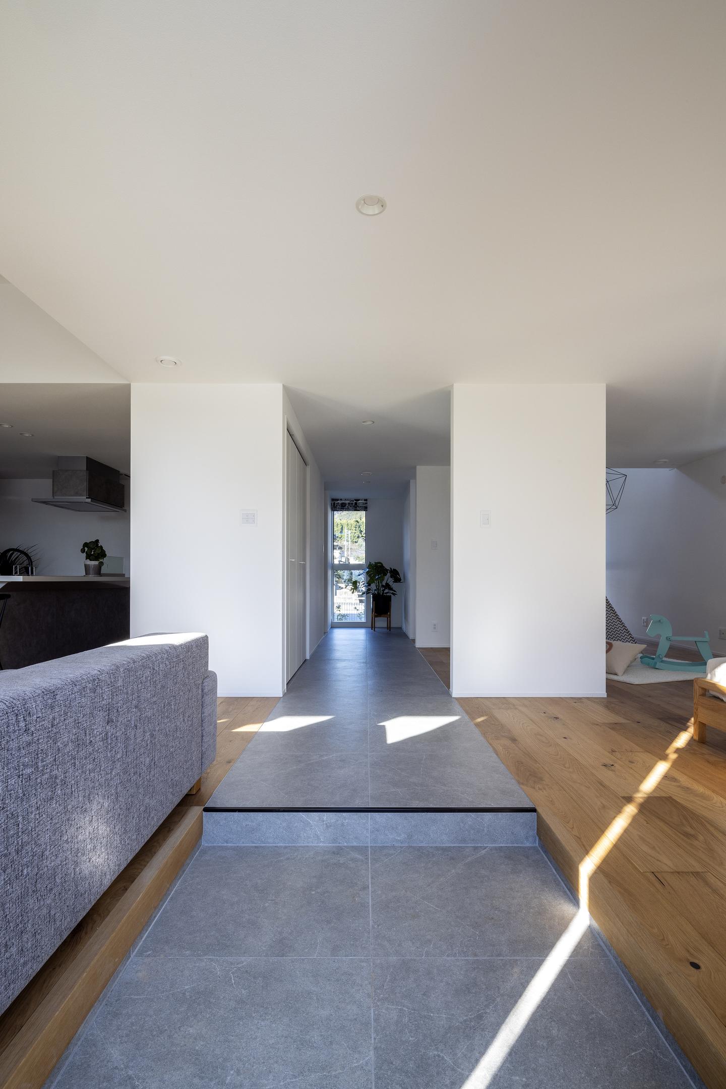 勾配天井へと続く大きな窓から、やわらかな自然光が降り注ぎ、心地よい空間を演出します。