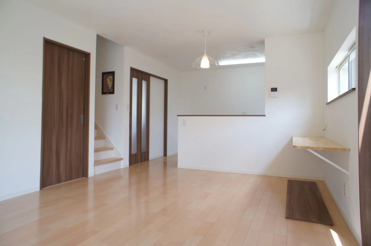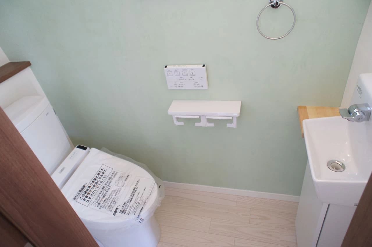 予算を考え、家をコンパクトにするため、階段下にトイレを設けた。壁・天井は色を変えて珪藻土を塗っている。
