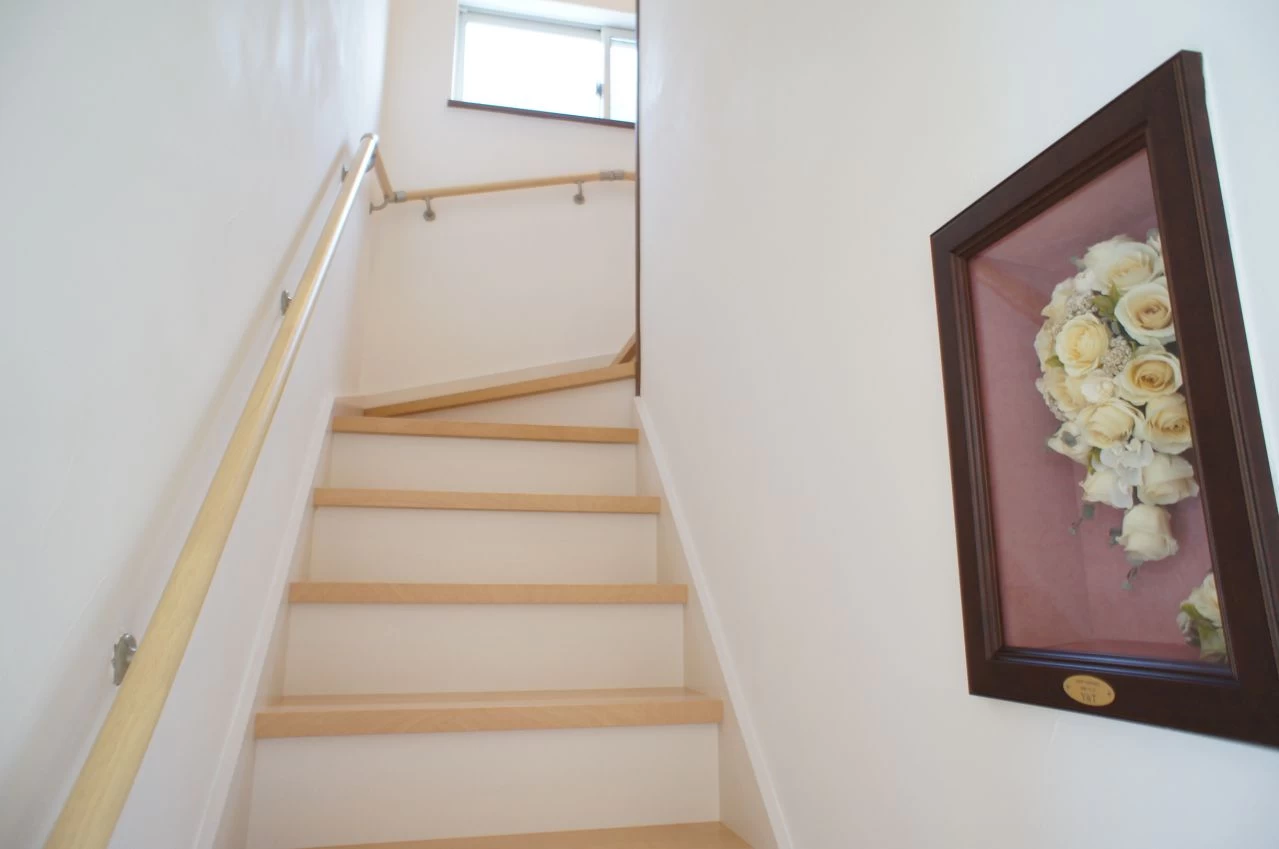 壁は漆喰が塗られていて、さらに結婚式にもらったブーケを埋め込んでいるとても印象的な階段。