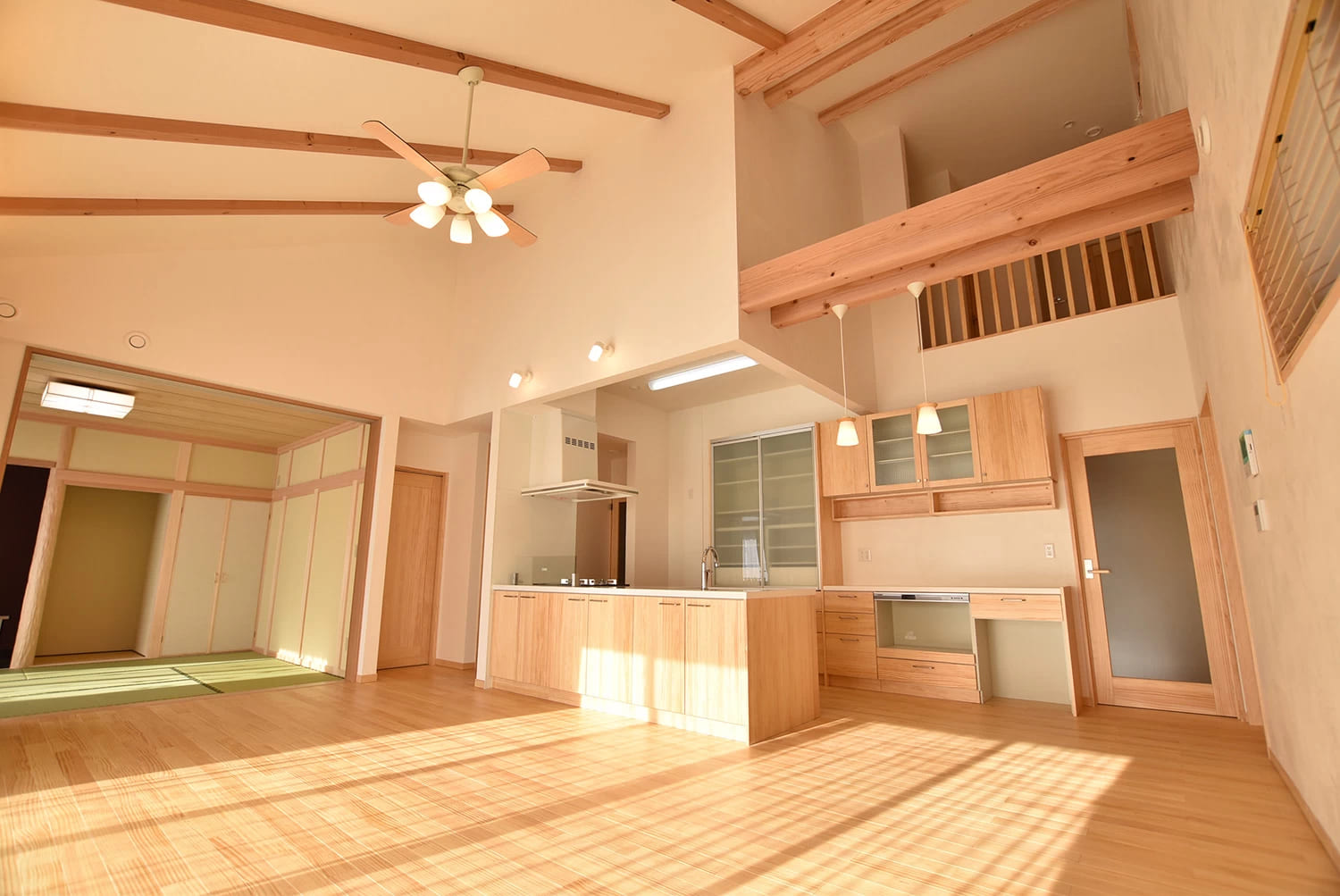 南向きのLDK。冬には写真の様に奥まで陽が差し込みます。2階まで吹き抜けで続いていますが、とても暖かい空間に。また床材と建具は無垢材を使用。壁には漆喰を塗っています。