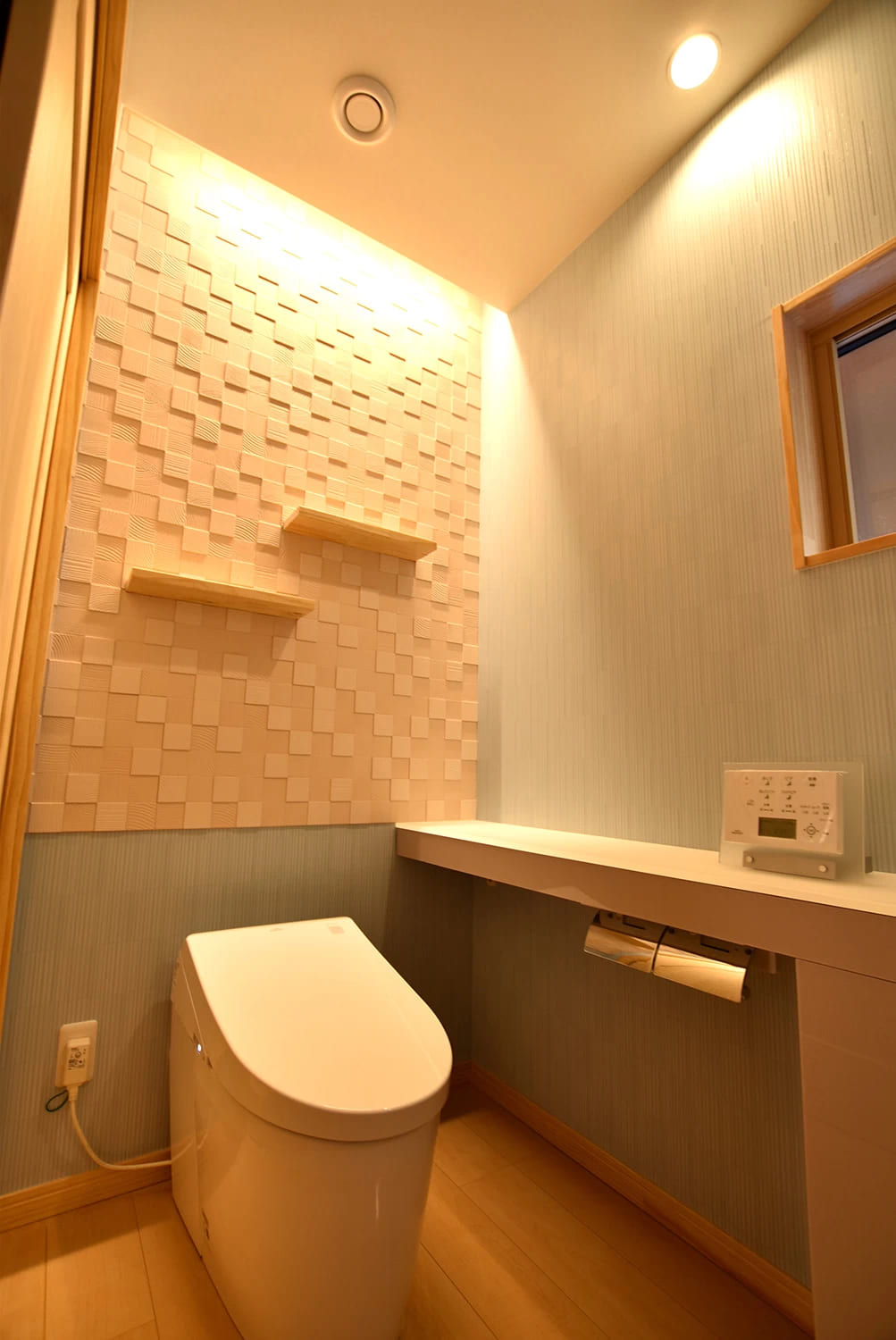 間接照明で落ち着いた雰囲気のトイレ。正面の壁には吸放湿、吸臭に優れたエコカラットタイルを使用しています。