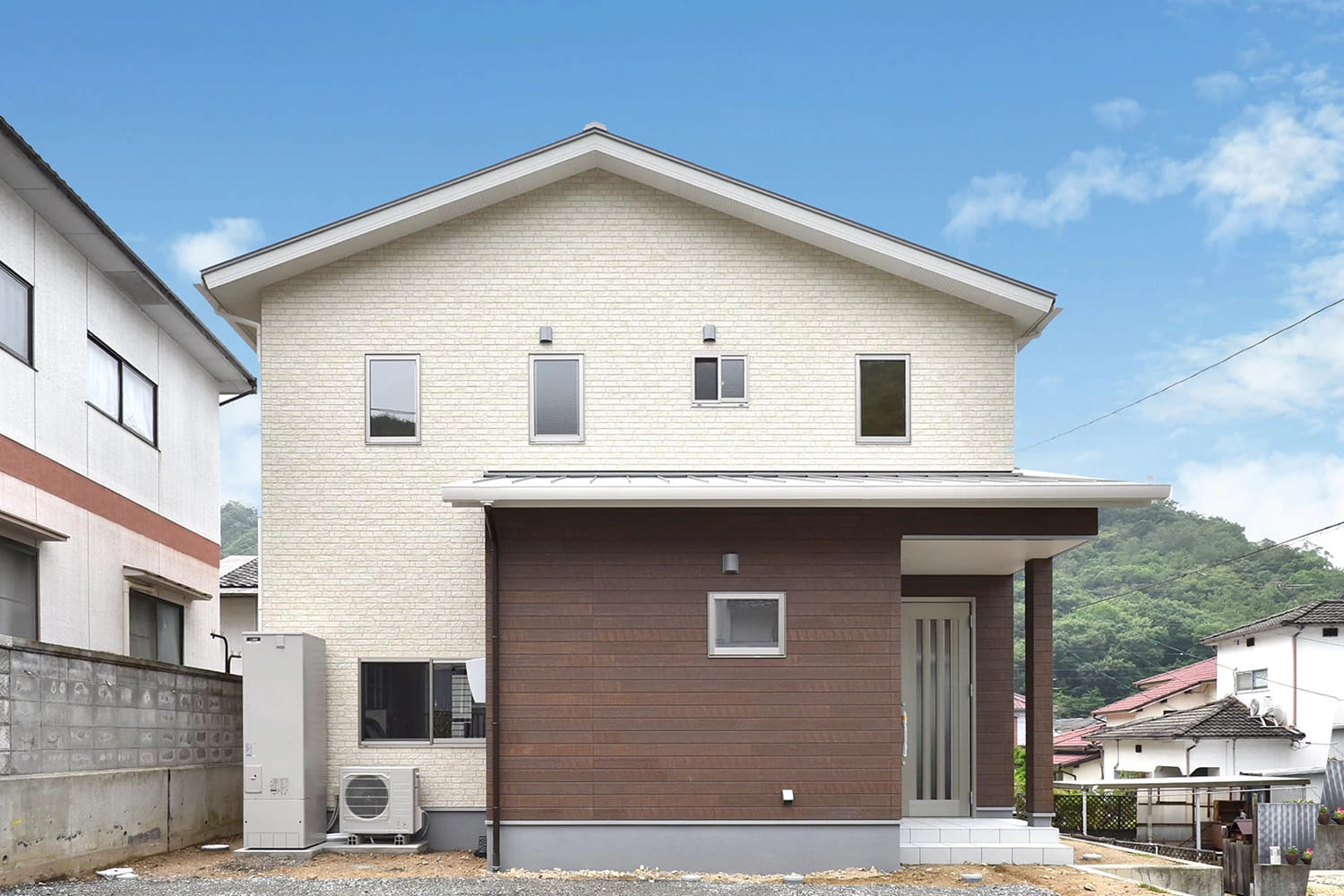 クリーム色のサイディングをベースに玄関先はミディアムブラウンでアクセントを。
