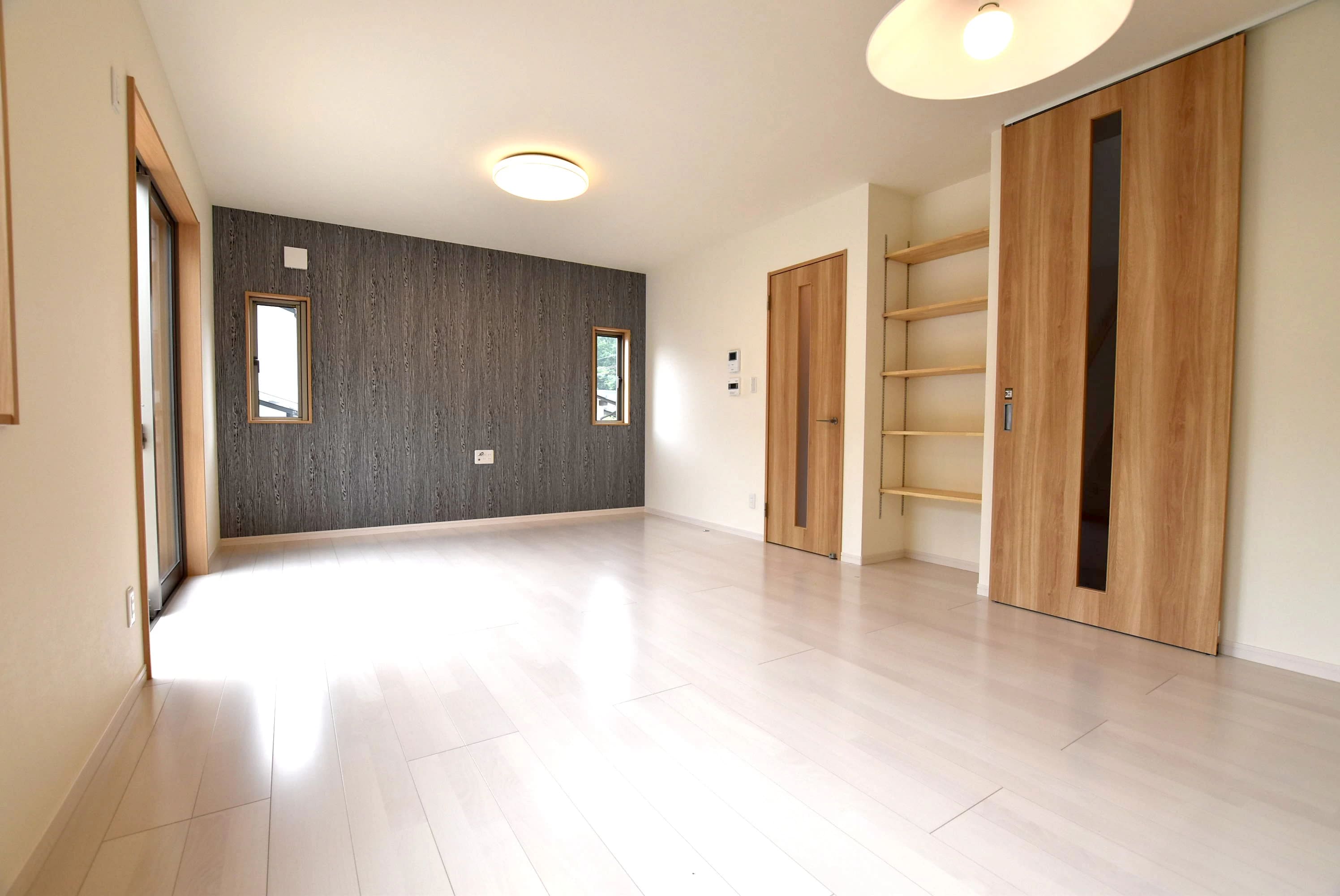 家族が集まるLDK。収納棚も設置しごちゃごちゃしがちなリビングもすっきり。