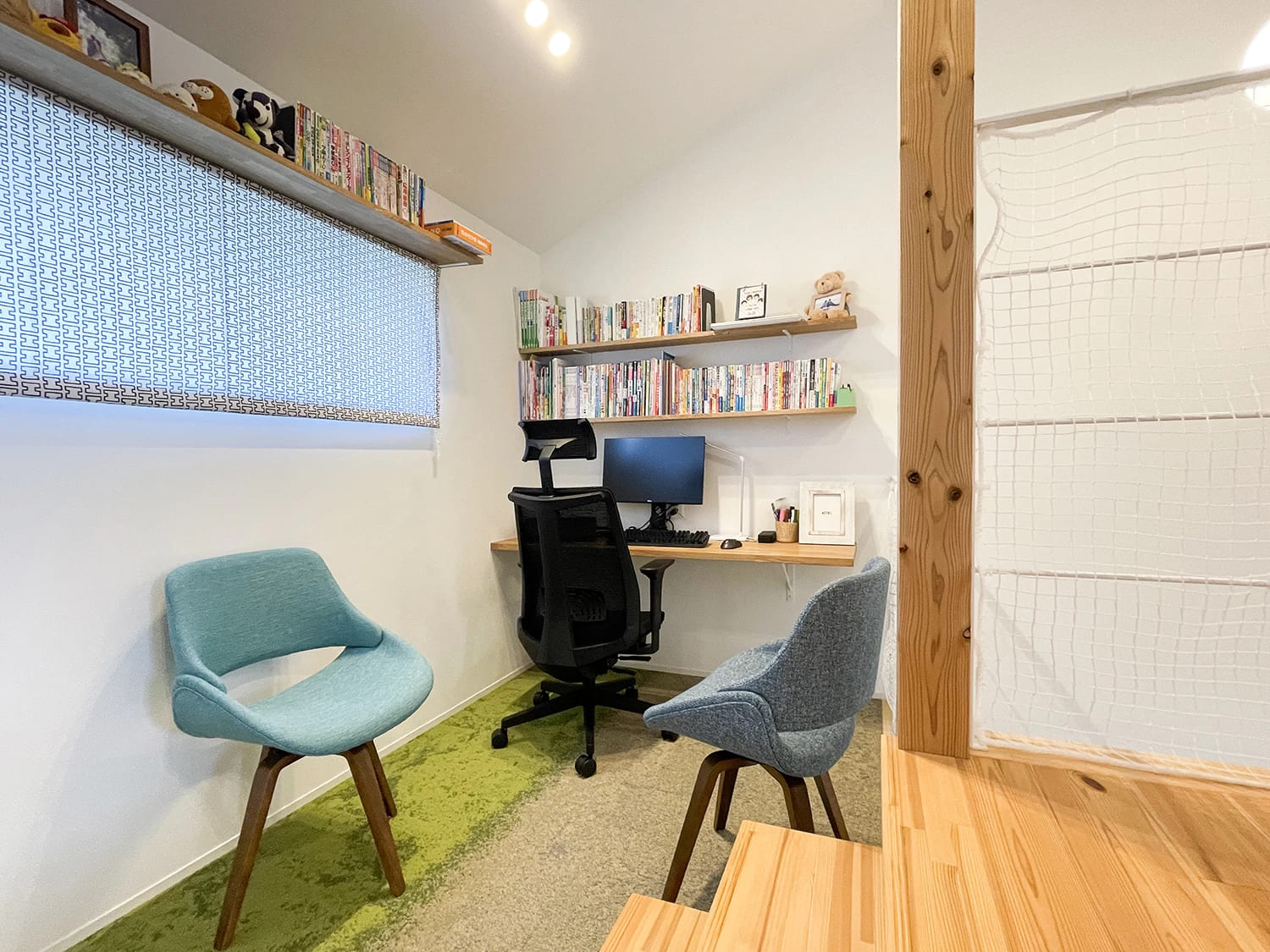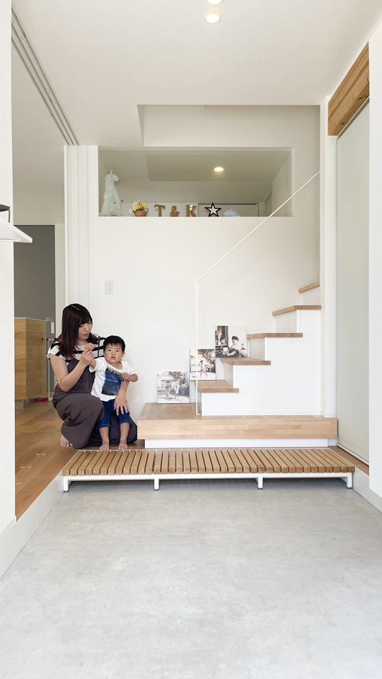 階段の途中に設けられたフリースペースは、書斎や子どもの遊び場にもってこい。遊びが広がる空間です。