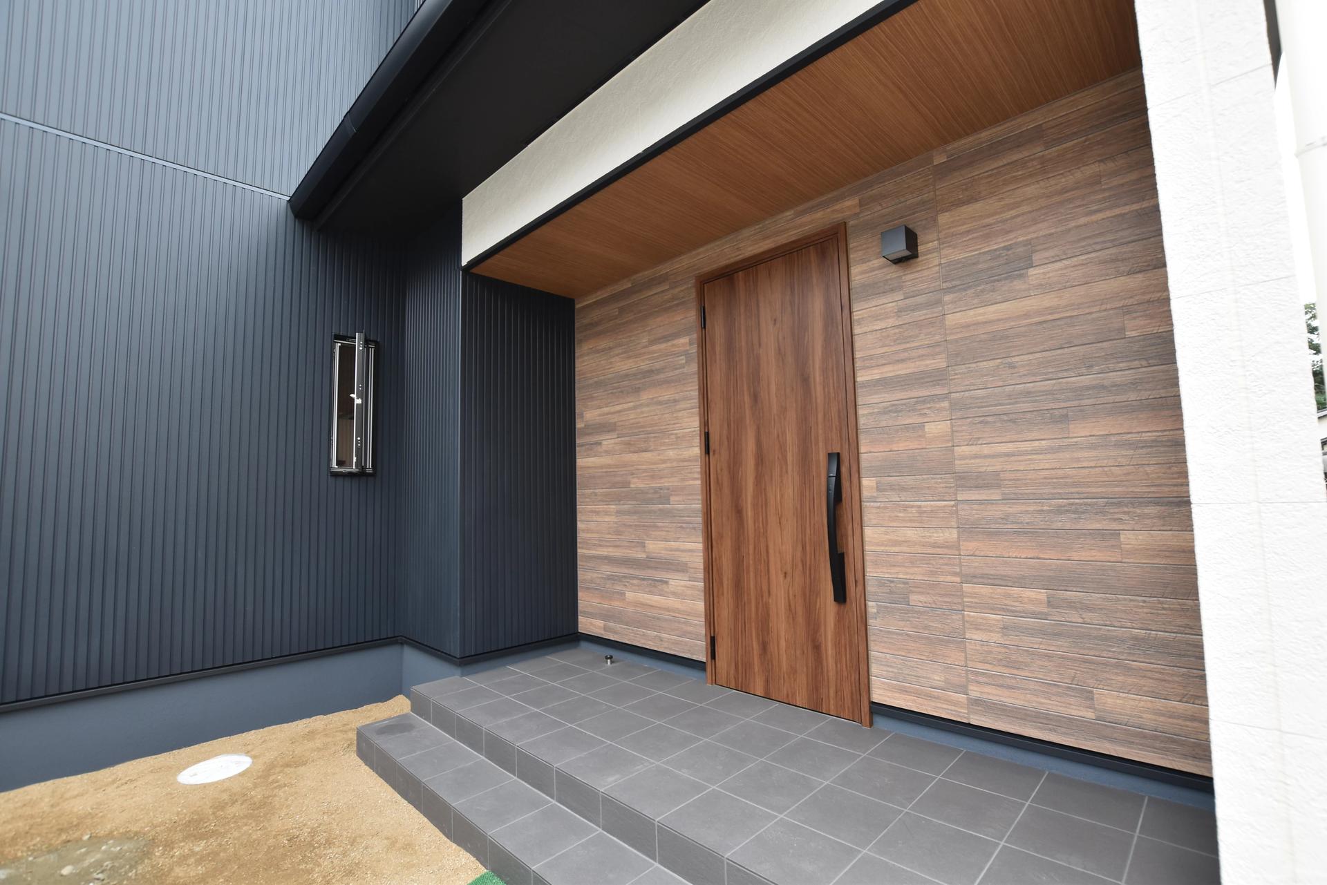 カッコいい玄関先。ネイビー色の外壁に木目調の玄関がグッと引き立ちます!