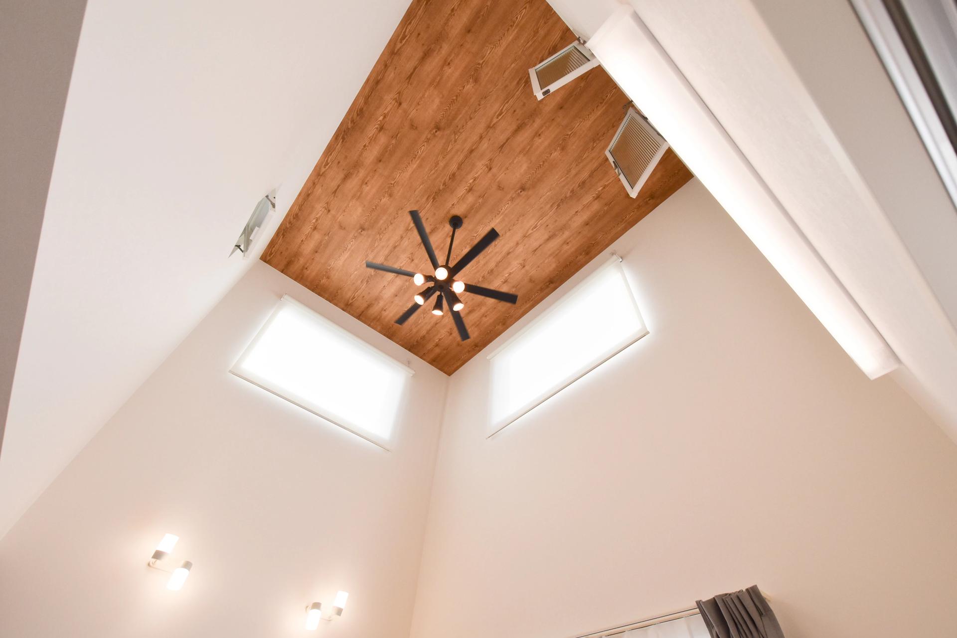 大きな窓と吹き抜けから光が差し込み明るいLDK。