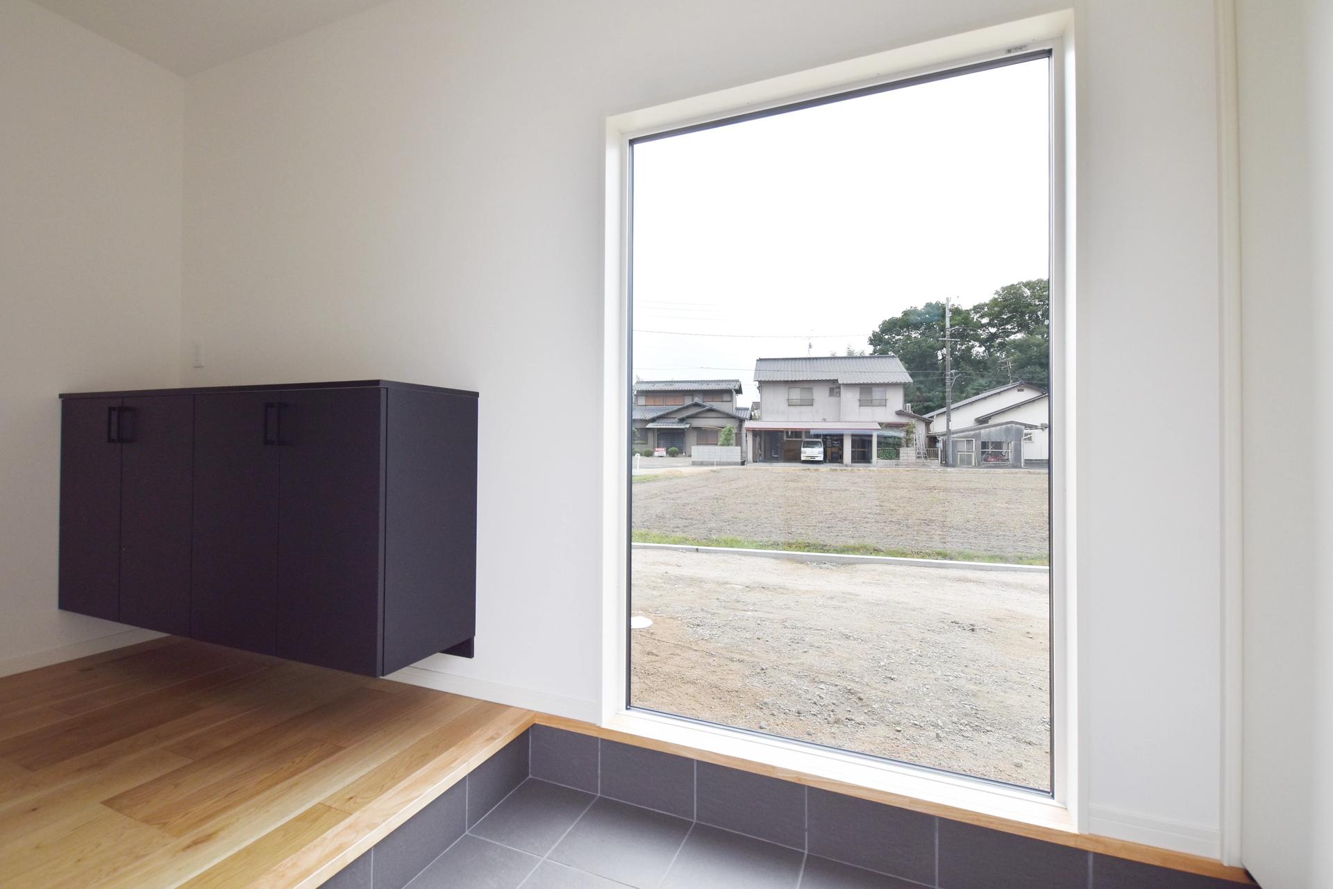玄関を開けると最初に飛び込んでくる光景。植栽を植えてFIX窓から緑を眺められるよう設計しました!