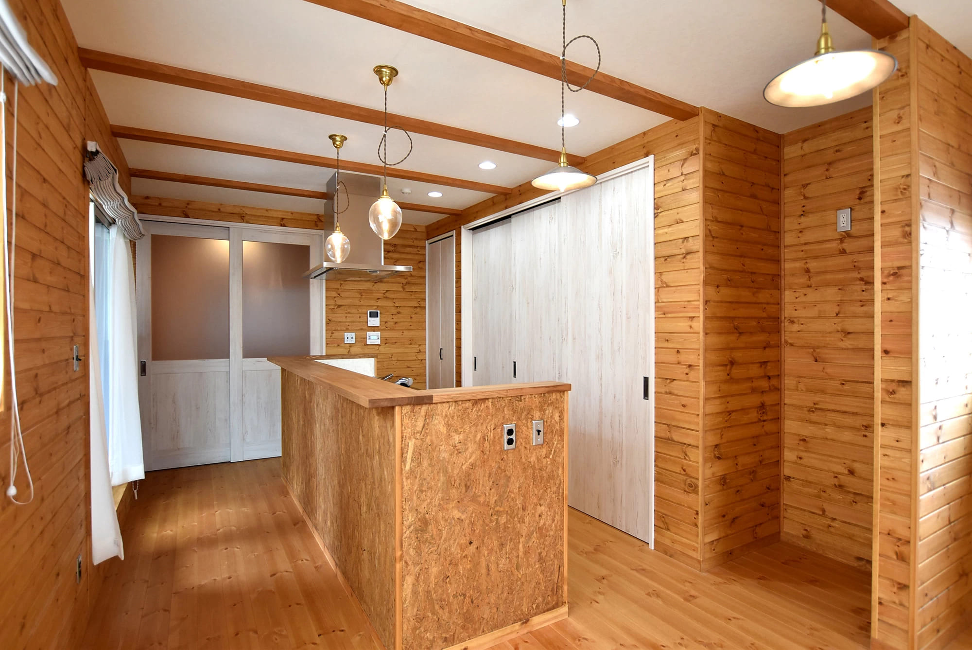 間口の狭い狭小地なので、光を取り込むためLDKは2階に。木に囲まれて暮らしたいと、壁と床には無垢のパイン材を使用しました。壁のパイン材は床の色に合わせてお施主様と親族様、スタッフで塗装!その甲斐あって、とても風合いのよい色になりました。