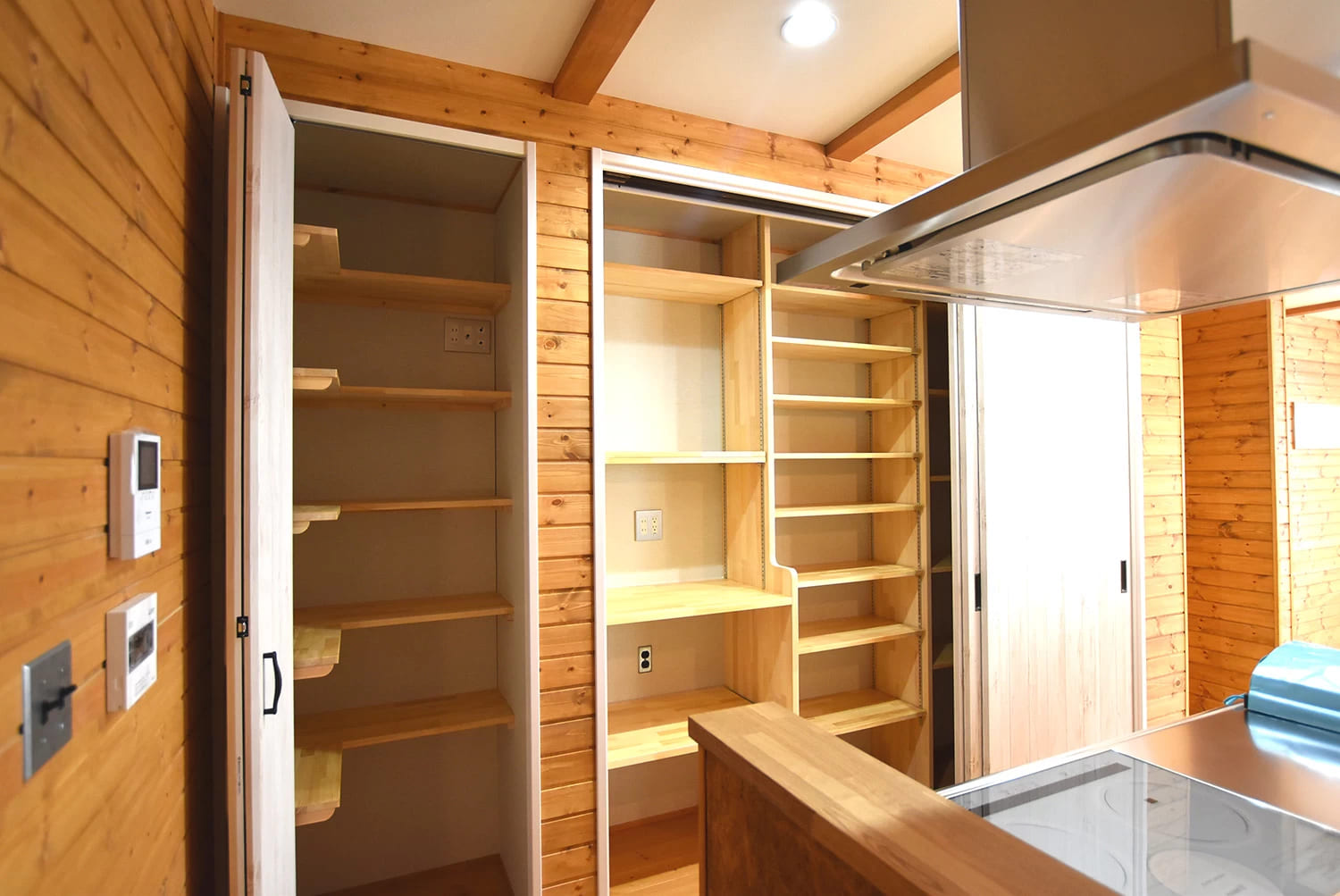 食器や家電を置くカップボードはキッチン後ろの収納に造作で。来客の際には扉を閉めると、生活感を出すことなく、スッキリ見せることができます。